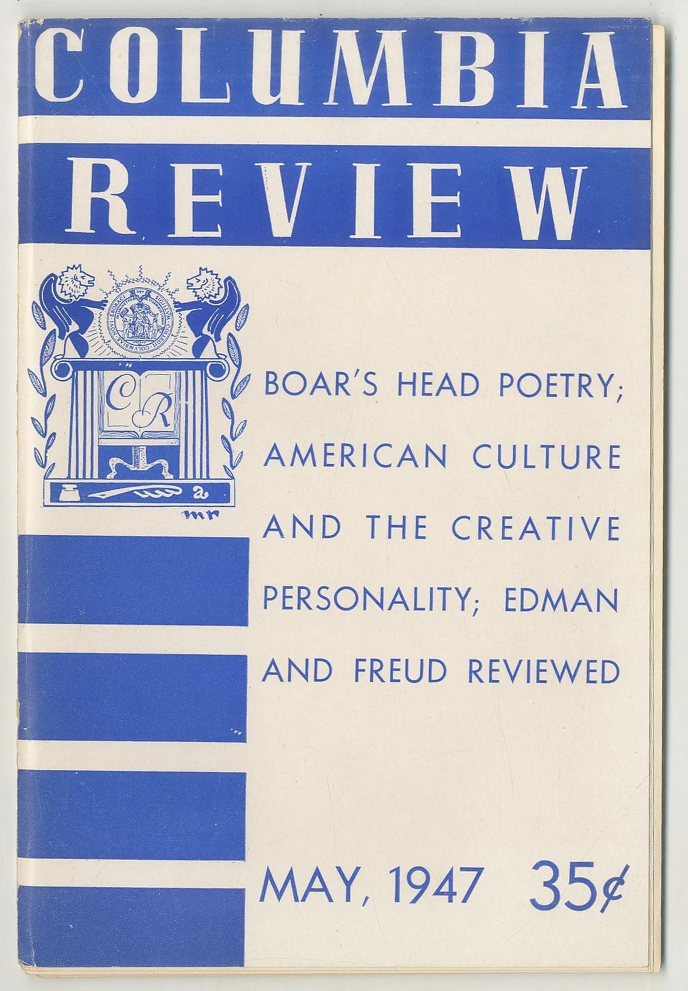 After a December 1931 merger with The Morningside, the Varsity Review became known as the Columbia Review. The newly unified editorial boards adopted a stricter format, publishing original fiction, poetry, and essays written by students and professors at Columbia. An emphasis was still placed on criticism, and in 1932, an article by John Dewey called for political writing and criticism within the newly branded magazine. In 1933 the Columbia Review took over the Boar’s Head Poetry Contest, a prize for the best undergraduate writing, and since then has published exclusively literary work, no longer reporting campus news.
